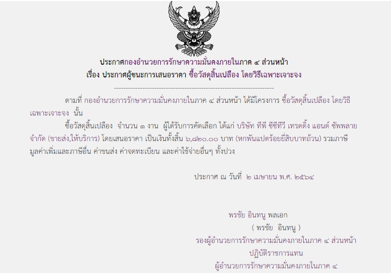 จัดซื้อ จัดจ้างประกาศผู้ชนะการเสนอราคา ประกาศผู้ชนะการเสนอราคา ซื้อวัสดุสิ้นเปลือง โดยวิธีเฉพาะเจาะจง ( ๖,๘๒๐.๐๐ บาท ) May 24, 2021 697 Share Facebook Twitter Google+ Telegram LINE กอ.รมน.ภาค ๔ สน.