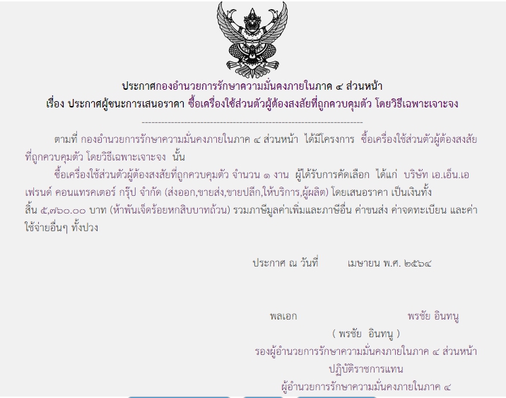 จัดซื้อ จัดจ้างประกาศผู้ชนะการเสนอราคา ประกาศผู้ชนะการเสนอราคา ซื้อเครื่องใช้ส่วนตัวผู้ต้องสงสัยที่ถูกควบคุมตัว โดยวิธีเฉพาะเจาะจง ( ๕,๗๖๐.๐๐ บาท ) May 24, 2021 627 Share Facebook Twitter Google+ Telegram LINE กอ.รมน.ภาค ๔ สน.
