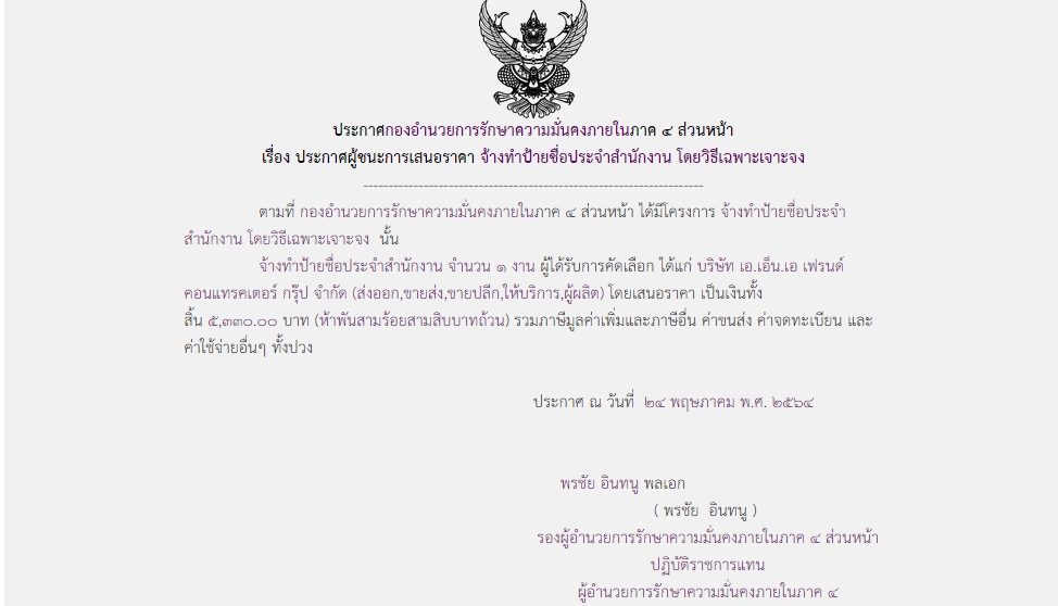 ประกาศผู้ชนะการเสนอราคา จ้างทำป้ายชื่อประจำสำนักงาน โดยวิธีเฉพาะเจาะจง ( ๕,๓๓๐.๐๐ บาท )