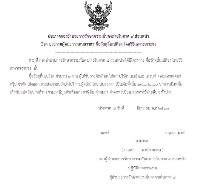 ประกาศผู้ชนะเสนอราคา ซื้อวัสดุสิ้นเปลือง โดยวิธีเฉพาะเจาะจง (19,080.00)