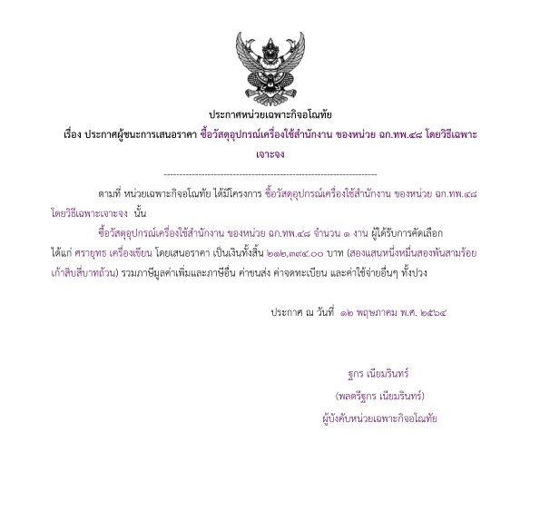 จัดซื้อ จัดจ้างประกาศผู้ชนะการเสนอราคา ประกาศผู้ชนะการเสนอราคา ซื้อวัสดุอุปกรณ์เครื่องใช้สำนักงาน ของหน่วย ฉก.ทพ.48 โดยวิธีเฉพาะเจาะจง (212,394.00) May 31, 2021 595 Share Facebook Twitter Google+ Telegram LINE ฉก.อโณทัย
