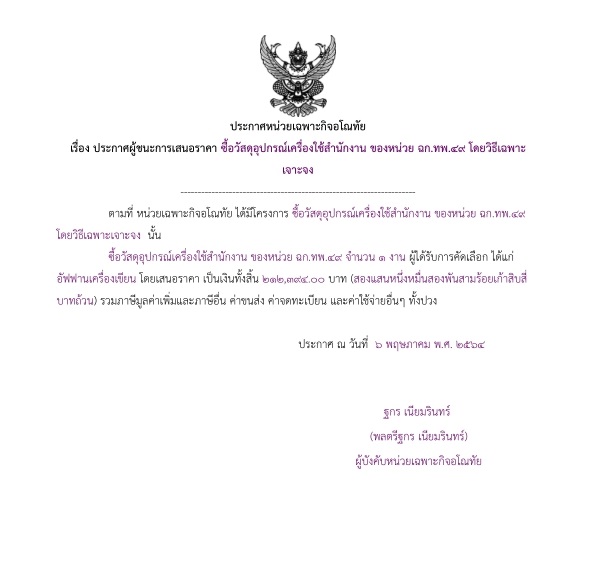 จัดซื้อ จัดจ้างประกาศผู้ชนะการเสนอราคา ประกาศผู้ชนะการเสนอราคา ซื้อวัสดุอุปกรณ์เครื่องใช้สำนักงาน ของหน่วย ฉก.ทพ.49 โดยวิธีเฉพาะเจาะจง (212,394.00) May 31, 2021 647 Share Facebook Twitter Google+ Telegram LINE ฉก.อโณทัย