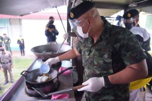 โดยแม่ทัพภาคที่ 4 ได้เดินทางไปยัง ศูนย์ฝึกอาชีพ องค์การบริหารส่วนตำบลธารคีรี อำเภอสะบ้าย้อย จังหวัดสงขลา ที่ได้จัดตั้งเป็นสถานกักกันโรคประจำตำบล มอบอุปกรณ์เวชภัณฑ์ทางการแพทย์ให้เจ้าหน้าที่นำไปใช้ประโยชน์ป้องกันตนเอง ก่อนเดินทางไปยัง โรงพยาบาลส่งเสริมสุขภาพตำบลตาฆอ หมู่ที่ 1 ตำบลธารคีรี อำเภอสะบ้าย้อย จังหวัดสงขลา รับฟังบรรยายสรุปสถานการณ์การแพร่ระบาดของเชื้อไวรัส covid-19 จากศูนย์ปฏิบัติการควบคุมโรคอำเภอสะบ้าย้อย หลังรับฟังบรรยายสรุปสถานการณ์แล้ว แม่ทัพภาคที่ 4 ได้ร่วมกับเจ้าหน้าที่ และประชาชนจิตอาสา ประกอบอาหารปรุงสุก จากรถครัวสนามกองพันทหารปืนใหญ่ที่ 5 กรมทหารปืนใหญ่ที่ 5 และทำการบรรจุใส่กล่อง Army Delivery ปล่อยขบวนคาราวานรถดังกล่าวกว่า 10 คัน บรรจุอาหาร น้ำดื่ม แจกจ่ายให้กับประชาชนที่ได้รับผลกระทบจากการแพร่ระบาดของเชื้อไวรัส covid-19 ในพื้นที่ ตลอดจนเจ้าหน้าที่ประจำด่านตรวจ จุดตรวจประจำตำบล เพื่อเป็นการบรรเทาความเดือดร้อน และสร้างขวัญกำลังใจในวิกฤตการแพร่ระบาดของเชื้อไวรัส covid-19 โดยหลังจากปล่อยขบวนคาราวานรถ Army Delivery แล้ว แม่ทัพภาคที่ 4 ได้เดินทางไปยังจุดตรวจควบคุมการเข้า – ออก เข้มข้น หน้าป้อมชุดรักษาความปลอดภัยหมู่บ้านแกแดะ หมู่ที่ 5 ตำบลธารคีรี อำเภอสะบ้าย้อย จังหวัดสงขลา เพื่อพบปะให้กำลังใจเจ้าหน้าที่ชุดคัดกรอง covid-19 พร้อมมอบอาหาร เครื่องดื่ม ถุงยังชีพ ผลผลิตทางการเกษตร และอุปกรณ์ป้องกัน เชื้อไวรัส covid-19 ให้กับผู้แทนหมู่บ้าน และผู้แทนบุคลากรทางการแพทย์ เพื่อนำไปมอบให้กับพี่น้องประชาชนตลอดจนเจ้าหน้าที่ประจำจุดตรวจต่าง ๆ ที่ยังคงได้รับผลกระทบ