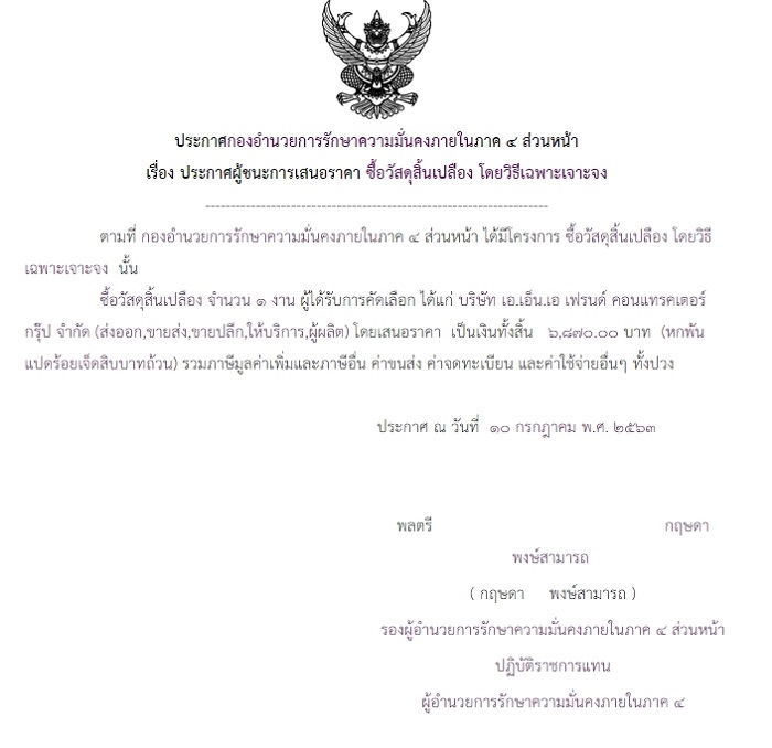 ประกาศผู้ชนะเสนอราคา ซื้อวัสดุสิ้นเปลือง โดยวิธีเฉพาะเจาะจง (6,870.00)