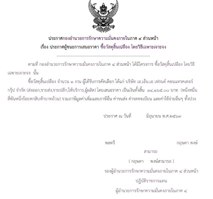 ประกาศผู้ชนะเสนอราคา ซื้อวัสดุสิ้นเปลือง โดยวิธีเฉพาะเจาะจง (14,165.00)