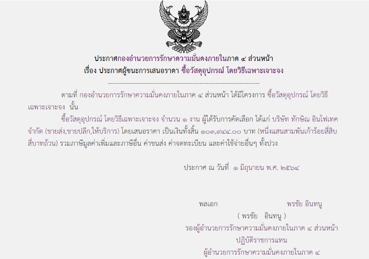จัดซื้อ จัดจ้างประกาศผู้ชนะการเสนอราคา ประกาศผู้ชนะการเสนอราคา ซื้อวัสดุอุปกรณ์ โดยวิธีเฉพาะเจาะจง ( ๑๐๓,๙๔๔.๐๐ บาท ) June 5, 2021 630 Share Facebook Twitter Google+ Telegram LINE กอ.รมน.ภาค ๔ สน.