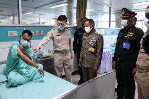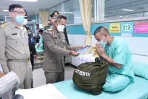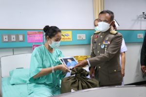 จากนั้นเวลา 09.00 น. ได้เดินทางไปยังโรงพยาบาลสุไหงโก-ลก อำเภอสุไหงโกลก จังหวัดนราธิวาส เยี่ยมให้กำลังใจ พร้อมเชิญสิ่งของพระราชทานมอบแก่เจ้าหน้าที่ที่ได้รับบาดเจ็บจากเหตุการณ์ความไม่สงบในพื้นที่จังหวัดชายแดนภาคใต้ จำนวน 3 ชุด ได้แก่ 1.จ่าสิบเอกหญิง วิลาวัลย์ ภัทรศรีพรหม 2. สิบตรี อุสมัน สมาแห, 3. สิบเอก อนันต์ มณีโชติ ซึ่งได้รับบาดเจ็บจากเหตุคนร้ายลอบวางระเบิดขณะปฏิบัติหน้าที่ บริเวณ หมู่ 3 บ้านดอเฮะ ตำบลริโก๋ อำเภอสุไหงปาดี จังหวัดนราธิวาส เมื่อวันที่ 21 พฤษภาคม 2564 ที่ผ่านมา ในการนี้ องคมนตรี ได้อัญเชิญพระราชกระแสทรงห่วงใยและทรงให้กำลังใจของพระบาทสมเด็จพระเจ้าอยู่หัว มากล่าวกับเจ้าหน้าที่ ยังความซาบซึ้งในพระมหากรุณาธิคุณอย่างหาที่สุดมิได้ ทั้งนี้ องคมนตรีได้พบปะพูดคุยสอบถามความเป็นอยู่ รวมถึงให้กำลังใจครอบครัวและเจ้าหน้าที่ตลอดจนบุคลากรทางการแพทย์