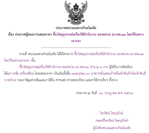 จัดซื้อ จัดจ้างประกาศผู้ชนะการเสนอราคา ประกาศผู้ชนะการเสนอราคา ซื้อวัสดุอุปกรณ์เครื่องใช้สำนักงาน ของหน่วย ฉก.ทพ.33 โดยวิธีเฉพาะเจาะจง (จำนวนเงิน 195,554.- บาท) July 30, 2020 931 Share Facebook Twitter Google+ Telegram LINE หน่วยเฉพาะกิจอโณทัย