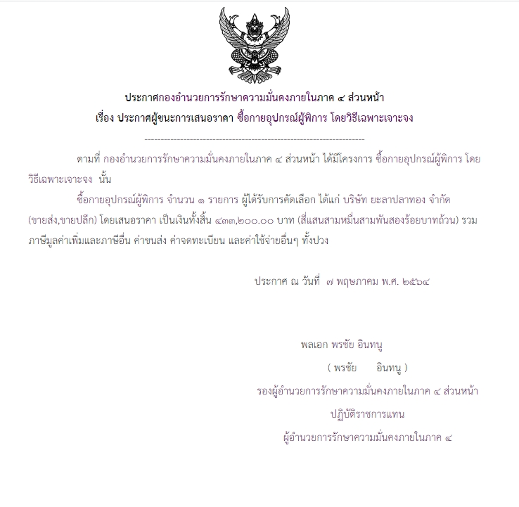 ประกาศผู้ชนะการเสนอราคา ซื้อกายอุปกรณ์ผู้พิการ โดยวิธีเฉพาะเจาะจง ( ๔๓๓,๒๐๐.๐๐ บาท )