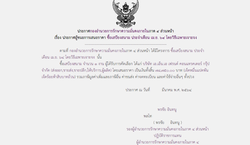 จัดซื้อ จัดจ้างประกาศผู้ชนะการเสนอราคา ประกาศผู้ชนะการเสนอราคา ซื้อเสบียงสนาม ประจำเดือน เม.ย.๖๔ โดยวิธีเฉพาะเจาะจง ( ๗๘,๗๕๐.๐๐ บาท ) June 14, 2021 781 Share Facebook Twitter Google+ Telegram LINE กอ.รมน.ภาค ๔ สน.