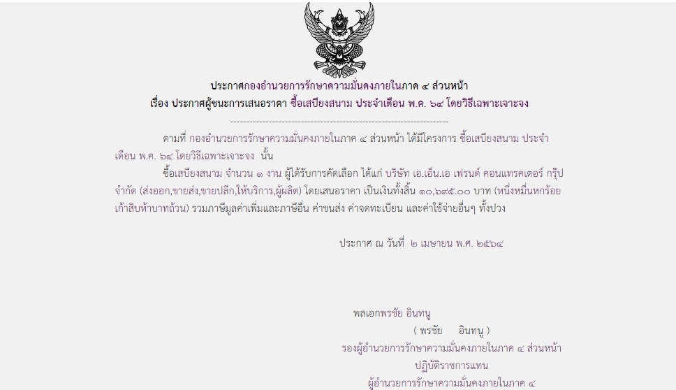 จัดซื้อ จัดจ้างประกาศผู้ชนะการเสนอราคา ประกาศผู้ชนะการเสนอราคา ซื้อเสบียงสนาม ประจำเดือน พ.ค.๖๔ โดยวิธีเฉพาะเจาะจง ( ๑๐,๖๙๕.๐๐ บาท ) June 14, 2021 603 Share Facebook Twitter Google+ Telegram LINE กอ.รมน.ภาค ๔ สน.