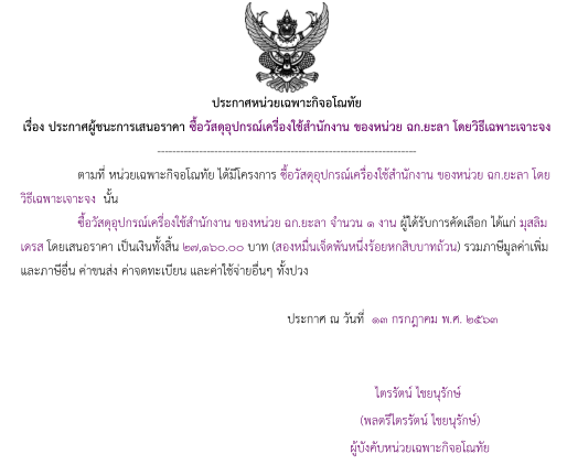 จัดซื้อ จัดจ้างประกาศผู้ชนะการเสนอราคา ประกาศผู้ชนะการเสนอราคา ซื้อวัสดุอุปกรณ์เครื่องใช้สำนักงาน ของหน่วย ฉก.ยะลา โดยวิธีเฉพาะเจาะจง (จำนวน 27,160.- บาท) July 30, 2020 1101 Share Facebook Twitter Google+ Telegram LINE หน่วยเฉพาะกิจอโณทัย