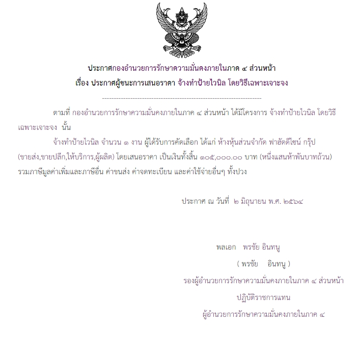 ประกาศผู้ชนะการเสนอราคา จ้างทำป้ายไวนิล โดยวิธีเฉพาะเจาะจง ( ๑๐๕,๐๐๐.๐๐ บาท )