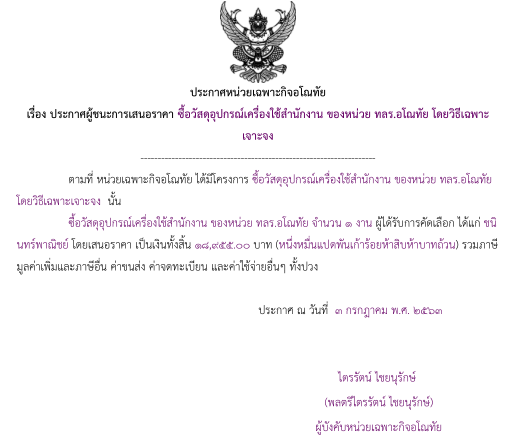ประกาศผู้ชนะการเสนอราคา ซื้อวัสดุอุปกรณ์เครื่องใช้สำนักงาน ของหน่วย ทลร.อโณทัย โดยวิธีเฉพาะเจาะจง (จำนวนเงิน 18,955.- บาท)
