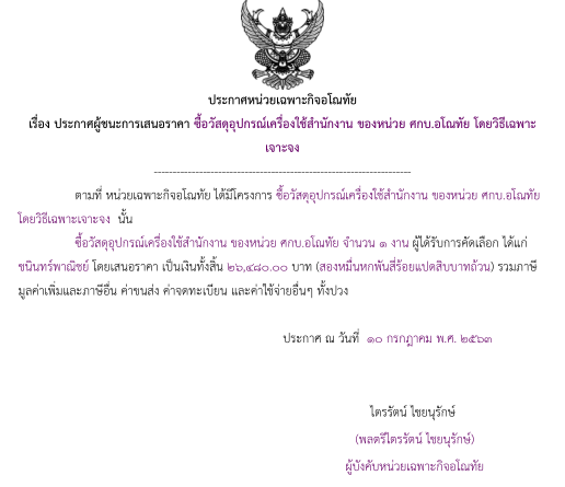 ประกาศผู้ชนะการเสนอราคา ซื้อวัสดุอุปกรณ์เครื่องใช้สำนักงาน ของหน่วย ศกบ.อโณทัย โดยวิธีเฉพาะเจาะจง (จำนวน 26,480.- บาท)