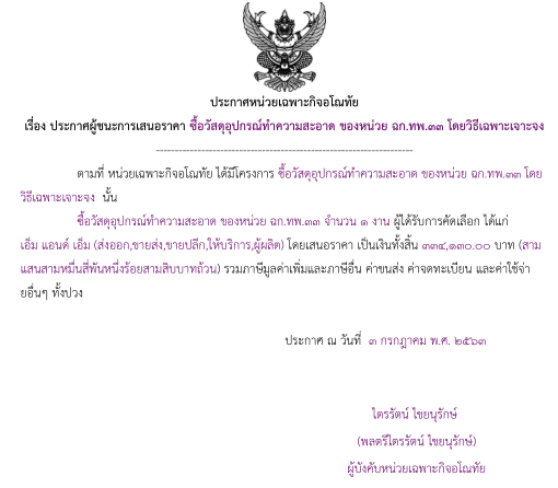 ประกาศผู้ชนะการเสนอราคา ซื้อวัสดุอุปกรณ์ทำความสะอาด ของหน่วย ฉก.ทพ.33 โดยวิธีเฉพาะเจาะจง (จำนวนเงิน 334,130.- บาท)
