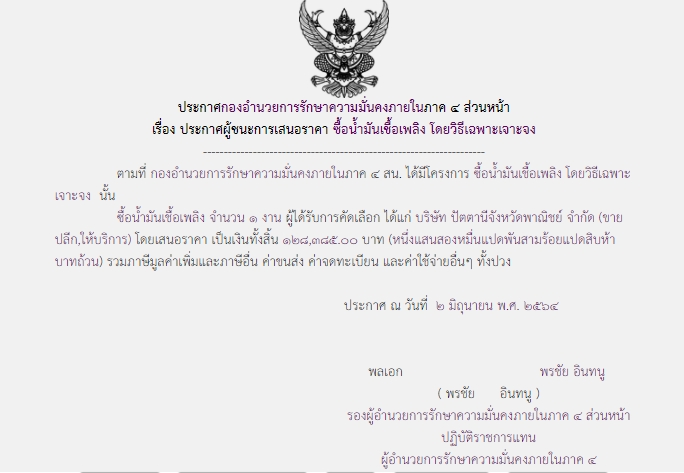 จัดซื้อ จัดจ้างประกาศผู้ชนะการเสนอราคา ประกาศผู้ชนะการเสนอราคา ซื้อน้ำมันเชื้อเพลิง โดยวิธีเฉพาะเจาะจง ( ๑๒๘,๓๘๕.๐๐ บาท ) June 20, 2021 473 Share Facebook Twitter Google+ Telegram LINE กอ.รมน.ภาค ๔ สน.