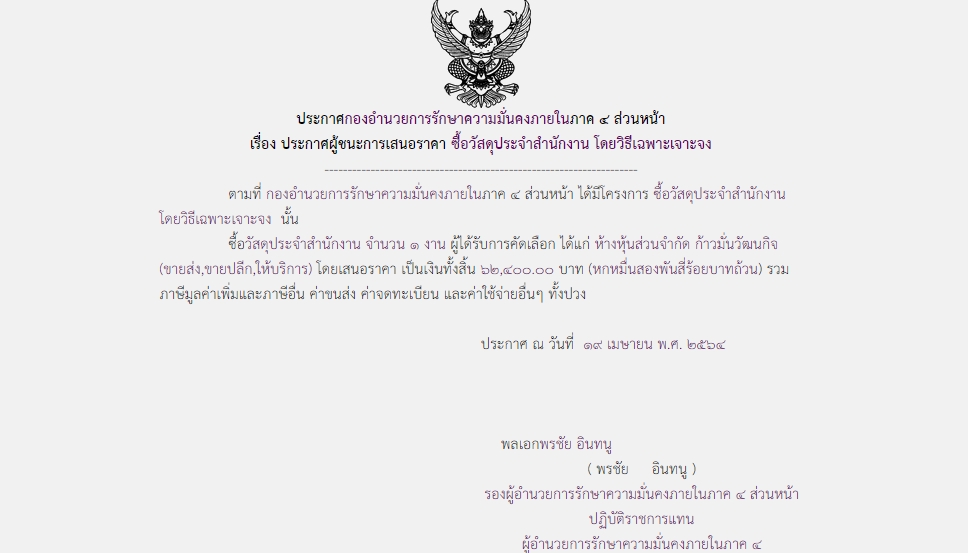 ประกาศผู้ชนะการเสนอราคา ซื้อวัสดุประจำสำนักงาน โดยวิธีเฉพาะเจาะจง ( ๖๒,๔๐๐.๐๐ บาท )