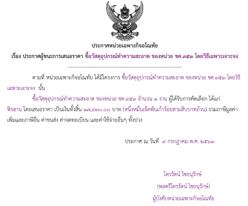 ประกาศผู้ชนะการเสนอราคา ซื้อวัสดุอุปกรณ์ทำความสะอาด ของหน่วย ชค.953 โดยวิธีเฉพาะเจาะจง (จำนวนเงิน 17,930.- บาท)