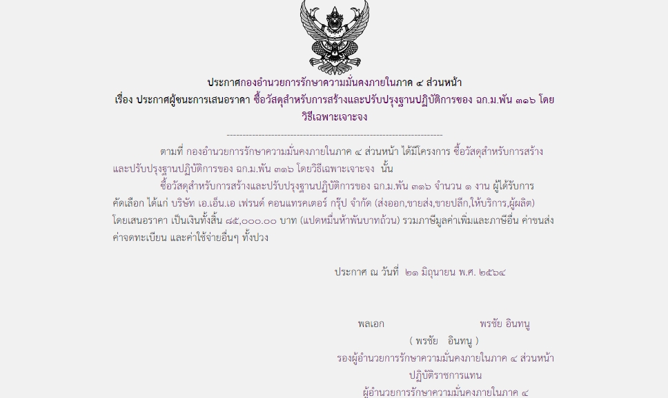 ประกาศผู้ชนะการเสนอราคา ซื้อวัสดุสำหรับการสร้างและปรับปรุงฐานปฏิบัติการของ ฉก.ม.พัน ๓๑๖ โดยวิธีเฉพาะเจาะจง ( ๘๕,๐๐๐.๐๐ บาท )