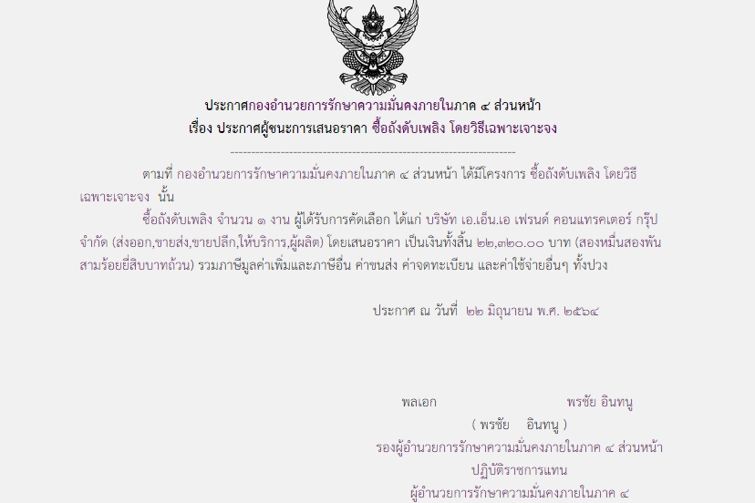 ประกาศผู้ชนะการเสนอราคา ซื้อถังดับเพลิง โดยวิธีเฉพาะเจาะจง ( ๒๒,๓๒๐.๐๐ บาท )