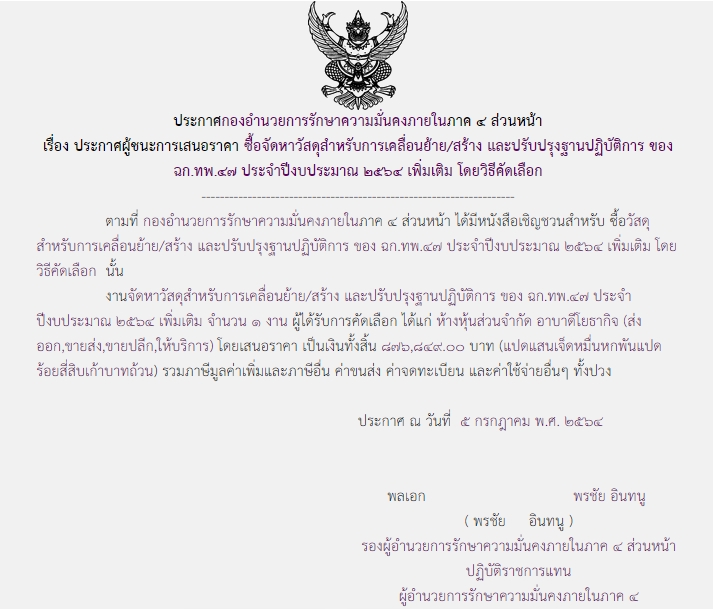 ประกาศผู้ชนะการเสนอราคา ซื้อจัดหาวัสดุสำหรับการเคลื่อนย้าย/สร้าง และปรับปรุงฐานปฏิบัติการ ของ ฉก.ทพ.๔๗ ประจำปีงบประมาณ ๒๕๖๔ เพิ่มเติม โดยวิธีคัดเลือก ( ๘๗๖,๘๔๙.๐๐ บาท )