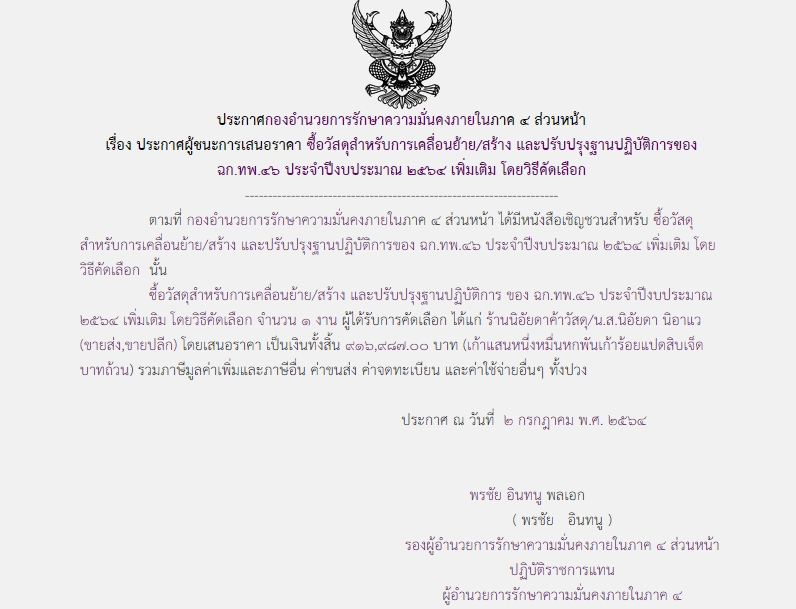 จัดซื้อ จัดจ้างประกาศผู้ชนะการเสนอราคา ประกาศผู้ชนะการเสนอราคา ซื้อจัดหาวัสดุสำหรับการเคลื่อนย้าย/สร้าง และปรับปรุงฐานปฏิบัติการ ของ ฉก.ทพ.๔๖ ประจำปีงบประมาณ ๒๕๖๔ เพิ่มเติม โดยวิธีคัดเลือก ( ๙๑๖,๙๘๗.๐๐ บาท ) July 2, 2021 639 Share Facebook Twitter Google+ Telegram LINE กอ.รมน.ภาค ๔ สน.