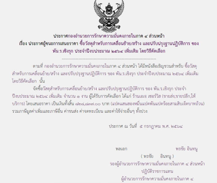ประกาศผู้ชนะการเสนอราคา ซื้อจัดหาวัสดุสำหรับการเคลื่อนย้าย/สร้าง และปรับปรุงฐานปฏิบัติการ ของ พัน.ร.เชิงรุก ประจำปีงบประมาณ ๒๕๖๔ เพิ่มเติม โดยวิธีคัดเลือก ( ๘๒๘,๘๓๗.๐๐ บาท )