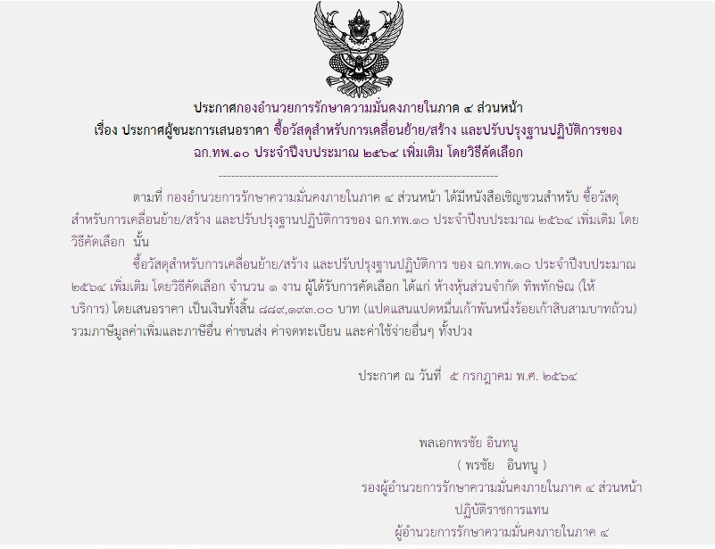 ประกาศผู้ชนะการเสนอราคา ซื้อจัดหาวัสดุสำหรับการเคลื่อนย้าย/สร้าง และปรับปรุงฐานปฏิบัติการ ของ ฉก.ทพ.๑๐ ประจำปีงบประมาณ ๒๕๖๔ เพิ่มเติม โดยวิธีคัดเลือก ( ๘๘๙,๑๙๓.๐๐ บาท )