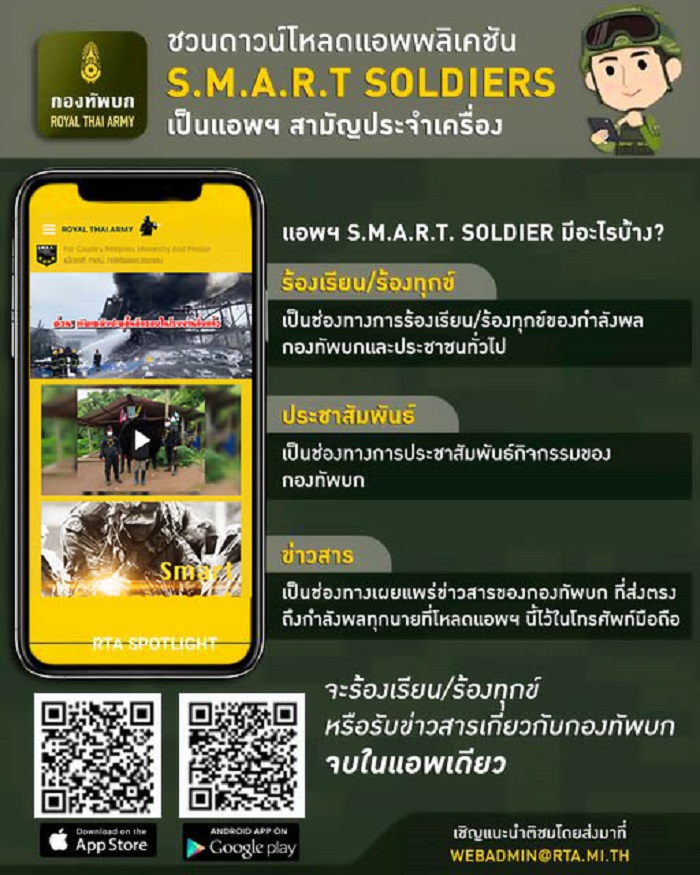 - แอพพลิเคชั่น S.M.A.R.T. SOLDIERS เวอร์ชั่นสมบูรณ์ จะเป็นแอพพลิเคชั่นที่ กองทัพบก (Royal Thai Army) เป็นผู้พัฒนาเท่านั้น
