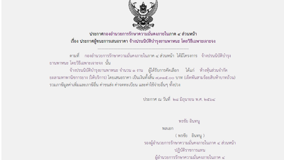 ประกาศผู้ชนะการเสนอราคา จ้างปรนนิบัติบำรุงยานพาหนะ โดยวิธีเฉพาะเจาะจง ( ๗,๓๑๕.๐๐ บาท )