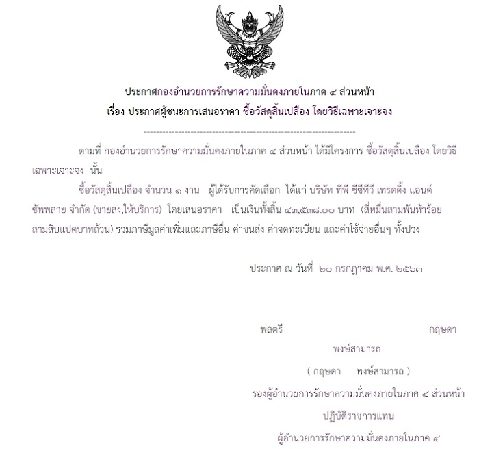 ประกาศผู้ชนะการเสนอราคา ซื้อวัสดุสิ้นเปลือง โดยวิธีเฉพาะเจาะจง (43,538.00)