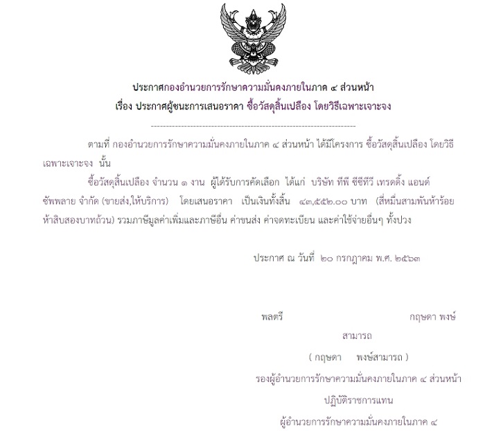 ประกาศผู้ชนะการเสนอราคา ซื้อวัสดุสิ้นเปลือง โดยวิธีเฉพาะเจาะจง (43,552.00)