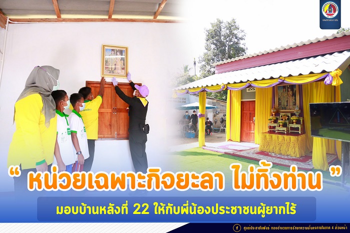 พลตรีอุทิศ อนันตนานนท์ ผู้บังคับหน่วยเฉพาะกิจยะลา/ หัวหน้าจิตอาสา 904 ภาค 4 เป็นประธานส่งมอบบ้านหลังที่ 22 ให้กับครอบครัว นางสาว ฮาพีนี ยาโงด ณ บ้านเลขที่ 48 หมู่ที่ 1 ตำบลบาโงซิแน อำเภอยะหา จังหวัดยะลา โดยมี หัวหน้าส่วนราชการ, ผู้นำท้องที่, ผู้นำท้องถิ่น และพี่น้องประชาชนในพื้นที่ร่วมในพิธีส่งมอบบ้าน ทั้งนี้ ในการสร้างบ้านให้กับ นางสาว ฮาพีนี ยาโงด ได้รับความร่วมมือ และสนับสนุนวัสดุอุปกรณ์ต่างๆ จากผู้นำชุมชน รวมทั้งพี่น้องประชาชนในพื้นที่ โดยร่วมกับ หน่วยเฉพาะกิจกรมทหารพรานที่ 47 และ เจ้าหน้าที่ชุมคุ้มครองตำบล ในการจัดกำลังพลชุดช่าง เข้าดำเนินการก่อสร้างจนแล้วเสร็จ และส่งมอบบ้านให้กับนางสาว ฮาพีนีฯ ในครั้งนี้ เพื่อแก้ปัญหาการไม่มีที่อยู่อาศัย และเป็นการพัฒนาคุณภาพชีวิตให้กับผู้ที่มีจิตสาธารณะช่วยเหลือชุมชนและสังคมมาโดยตลอดซึ่งต้องได้รับการยอมรับจากทุกภาคส่วน