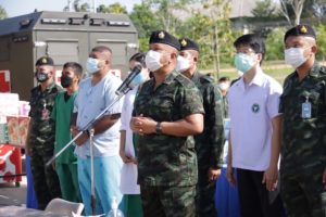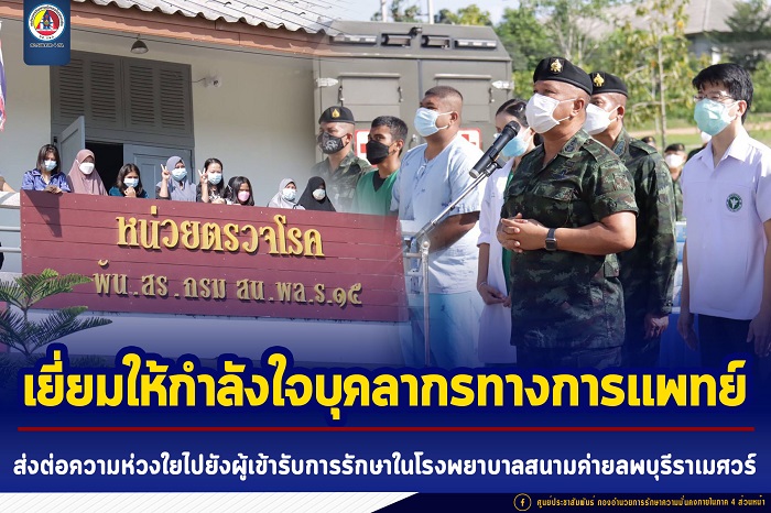 โดยแม่ทัพภาคที่ 4 เข้ารับฟังการบรรยายสรุปผลการปฏิบัติงาน และรับทราบปัญหาข้อขัดข้องการดำเนินงานของหน่วยในห้วงที่ผ่านมา ก่อนเดินตรวจเยี่ยมโรงพยาบาลสนามค่ายลพบุรีราเมศวร์ ชื่นชมการปฏิบัติงานของเจ้าหน้าที่ และกล่าวขอบคุณกำลังพล และเจ้าหน้าที่ทุกคนที่ทุ่มเท เสียสละปฏิบัติงาน ช่วยเหลือดูแลพี่น้องประชาชน ที่ติดเชื้อไวรัส covid-19 อย่างเต็มกำลังความสามารถ นอกจากนี้ยังได้กล่าวให้กำลังใจพี่น้องประชาชนให้อดทน และมีกำลังใจสู้กับวิกฤตการแพร่ระบาดของเชื้อไวรัส covid-19 พร้อมฝากประชาสัมพันธ์เรื่องมาตรการป้องกันการแพร่ระบาดของเชื้อไวรัส covid-19 ให้กับประชาชน ซึ่งหากรักษาหายแล้วจะได้ร่วมกันเฝ้าระวังป้องกัน และประชาสัมพันธ์ให้กับผู้อื่นได้ตระหนัก และได้ร่วมกันปฏิบัติตามมาตรการป้องกันที่กระทรวงสาธารณสุขกำหนดอย่างเคร่งครัด เพื่อให้โรคติดเชื้อไวรัส covid-19 หมดสิ้นไป
