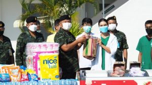 วันนี้ (17 กรกฎาคม 2564) เวลา 09.00 น. ที่ กองพันเสนารักษ์ กรมสนับสนุนกองพลทหารราบที่ 15 ค่ายลพบุรีราเมศวร์ ตำบลเกาะสะบ้า อำเภอเทพา จังหวัดสงขลา พลโท เกรียงไกร ศรีรักษ์ แม่ทัพภาคที่ 4 / ผู้อำนวยการรักษาความมั่นคงภายในภาค 4 ลงพื้นที่เยี่ยมให้กำลังใจ พี่น้องประชาชนที่เข้ารับการรักษายังโรงพยาบาลสนาม ตลอดจนเจ้าหน้าที่บุคลากรทางการโรงพยาบาลสนามค่ายลพบุรีราเมศวร์ กรมสนับสนุน กองพลทหารราบที่ 15 พร้อมนำเครื่องอุปโภคบริโภค และอุปกรณ์ทางการแพทย์มอบแก่เจ้าหน้าที่บุคลากรทางการแพทย์ ได้แก่ เจลแอลกอฮอล์ ขนาด 500 มล. จำนวน 3 ลัง, สเปรย์แอลกอฮอล์ จำนวน 6 แพ็ค, หน้ากากอนามัย จำนวน 400 ชิ้น, ชุด PPE จำนวน 50 ชุด เพื่อใช้ในภารกิจและดูแลผู้ติดเชื้อ covid-19 ให้เกิดประสิทธิภาพและความปลอดภัยสูงสุด ทั้งยังเป็นขวัญกำลังใจในการปฏิบัติงานต่อไป นอกจากอุปกรณ์ในการใช้ป้องกันตนเองแล้วแม่ทัพภาคที่ 4 ยังได้จัดตู้ไอศกรีม มอบให้แก่เจ้าหน้าที่บุคลากรทางการแพทย์ และพี่น้องประชาชนที่เข้ารับการรักษาได้รับประทานในช่วงเวลาพักคลายเครียดคลายความกังวลกันอีกด้วย โดยมี พลตรี ไพศาล หนูสังข์ ผู้บัญชาการกองพลทหารราบที่ 15 ผู้บังคับหน่วย เจ้าหน้าที่รับผิดชอบที่เกี่ยวข้องให้การต้อนรับ