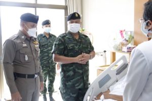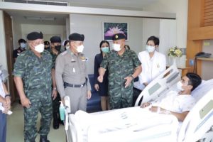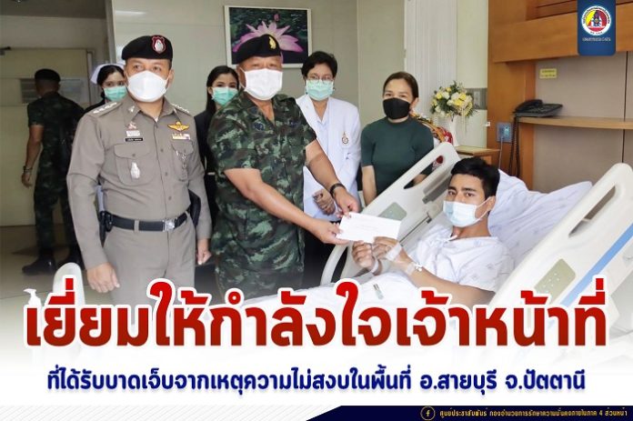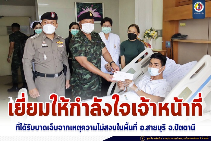 โดยแม่ทัพภาคที่ 4 ได้สอบถามอาการ และเหตุการณ์ที่เกิดขึ้น ชื่นชมความกล้าหาญในการปฏิบัติงานอย่างทุ่มเทและเสียสละ ขอให้มีขวัญ และกำลังใจที่ดีกลับมาปฏิบัติหน้าที่ต่อไป กำชับให้ทุกส่วนที่เกี่ยวข้องดูแลรักษาฟื้นฟูสภาพกำลังพลทั้งด้านร่างกาย และจิตใจที่ได้รับบาดเจ็บอย่างดีที่สุด ก่อนที่แม่ทัพภาคที่ 4 จะได้มอบกระเช้าเยี่ยมผู้ป่วย พร้อมเงินช่วยเหลือเป็นขวัญกำลังใจกับกำลังพล และขอบคุณทีมแพทย์พยาบาลที่ทำการดูแลรักษาพยาบาลผู้บาดเจ็บอย่างเต็มที่ ทั้งนี้เหตุการณ์ที่เกิดขึ้นถือเป็นการตอบโต้เจ้าหน้าที่รัฐหลังการบังคับใช้กฎหมายกับกลุ่มผู้ก่อเหตุรุนแรงในพื้นที่ดังกล่าว หลังจากนี้ให้ทุกหน่วยเพิ่มความระมัดระวังในการปฏิบัติหน้าที่มากยิ่งขึ้น ประสานการทำงานกับกำลังทุกภาคส่วนในรักษาความปลอดภัยในพื้นที่อย่างครอบคลุม ขณะนี้ได้สั่งการให้หน่วยที่เกี่ยวข้อง ดำเนินการตรวจสอบและรวบรวมวัตถุพยาน เพื่อติดตามจับกุมคนร้ายมาดำเนินคดีตามกฎหมายโดยเร็ว อย่างไรก็ตามต้องขอความร่วมมือไปยังพี่น้องประชาชน หากพบเห็นสิ่งผิดปกติหรือบุคคลต้องสงสัย ก็สามารถแจ้งเจ้าหน้าที่รัฐได้ทันที ที่สายด่วน 1341 หรือหมายเลขโทรศัพท์ 061-1732999 สายตรงแม่ทัพภาคที่ 4 ได้ตลอด 24 ชั่วโมง”