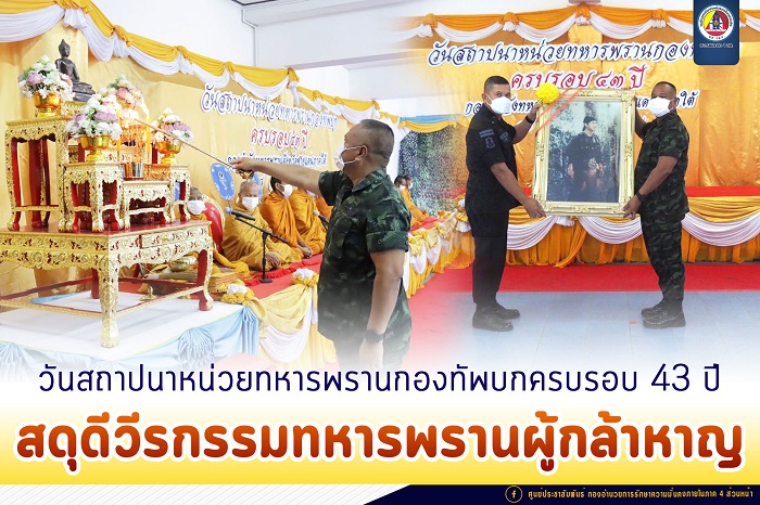 วันนี้ (18 กรกฎาคม 2564) เวลา 10.00 น. ที่ กองกำลังทหารพรานจังหวัดชายแดนภาคใต้ ค่ายอิงคยุทธบริหาร อำเภอหนองจิก จังหวัดปัตตานี พลโท เกรียงไกร ศรีรักษ์ แม่ทัพภาคที่ 4 / ผู้อำนวยการรักษาความมั่นคงภายในภาค 4 เป็นประธานในพิธีทำบุญเนื่องในวันสถาปนาหน่วยทหารพราน กองทัพบก ครบรอบปีที่ 43 โดยกองกำลังทหารพรานจังหวัดชายแดนภาคใต้ในฐานะหน่วยบังคับบัญชาของหน่วยเฉพาะกิจกรมทหารพราน จัดให้มีงาน “วันสถาปนาหน่วยทหารพรานกองทัพบกครบรอบ 43 ปี” ขึ้น เพื่ออุทิศบุญกุศล และระลึกถึงคุณงามความดีของกำลังพลทหารพรานที่ได้เสียสละทั้งชีวิต และวิญญาณในการปกป้องอธิปไตยของชาติมาอย่างต่อเนื่อง ตลอดจนเพื่อความเป็นสิริมงคลแก่หน่วยทหารพราน เป็นขวัญกำลังใจแก่กำลังพลทุกนาย ภายใต้มาตรการการป้องกันการแพร่ระบาดจากเชื้อไวรัส covid-19 โดยมีผู้บังคับบัญชา หัวหน้าส่วนราชการ ข้าราชการ ทหาร ตำรวจ อดีตผู้บังคับบัญชา และกำลังพลภายในหน่วยเข้าร่วมประกอบพิธี