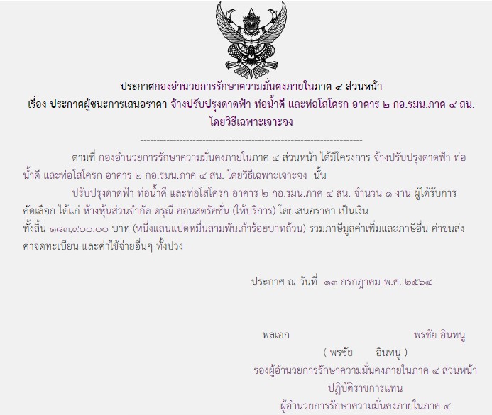 ประกาศผู้ชนะการเสนอราคา จ้างปรับปรุงดาดฟ้า ท่อน้ำดี และท่อโสโครก อาคาร ๒ กอ.รมน.ภาค ๔ สน. โดยวิธีเฉพาะเจาะจง ( ๑๘๓,๙๐๐.๐๐ บาท )