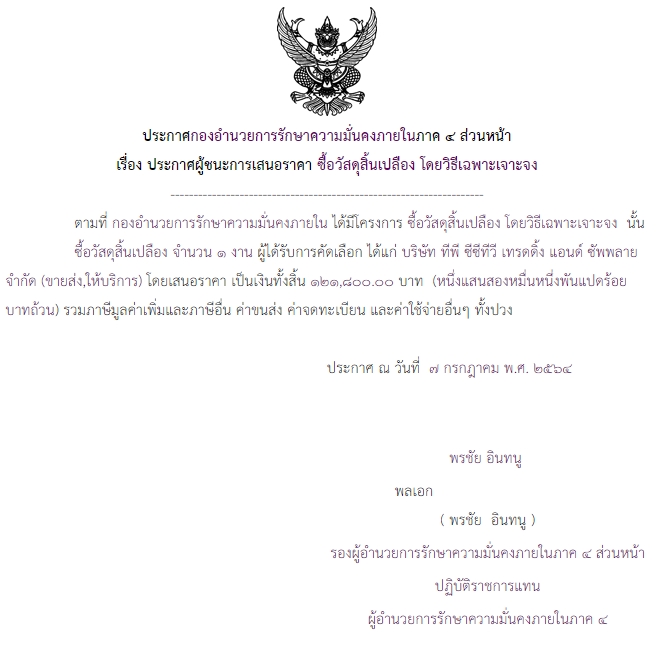 จัดซื้อ จัดจ้างประกาศผู้ชนะการเสนอราคา ประกาศผู้ชนะการเสนอราคา ซื้อวัสดุสิ้นเปลือง โดยวิธีเฉพาะเจาะจง ( ๑๒๑,๘๐๐.๐๐ บาท ) July 21, 2021 589 Share Facebook Twitter Google+ Telegram LINE กอ.รมน.ภาค ๔ สน.