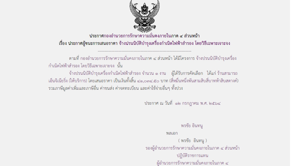 ประกาศผู้ชนะการเสนอราคา จ้างปรนนิบัติบำรุงเครื่องกำเนิดไฟฟ้าสำรอง โดยวิธีเฉพาะเจาะจง ( ๔๑,๐๓๔.๕๐ บาท )