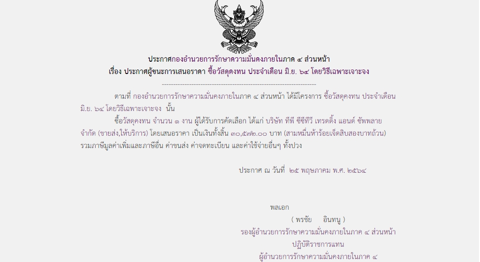 ประกาศผู้ชนะการเสนอราคา ซื้อวัสดุคงทน ประจำเดือน มิ.ย. ๖๔ โดยวิธีเฉพาะเจาะจง (๓๐,๕๓๒.๐๐ บาท )