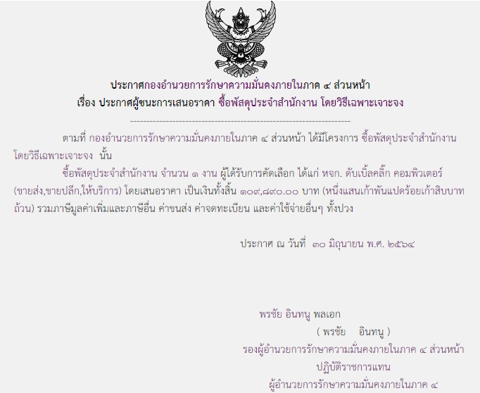 ประกาศผู้ชนะการเสนอราคา ซื้อพัสดุประจำสำนักงาน โดยวิธีเฉพาะเจาะจง ( ๑๐๙,๘๙๐.๐๐ บาท )