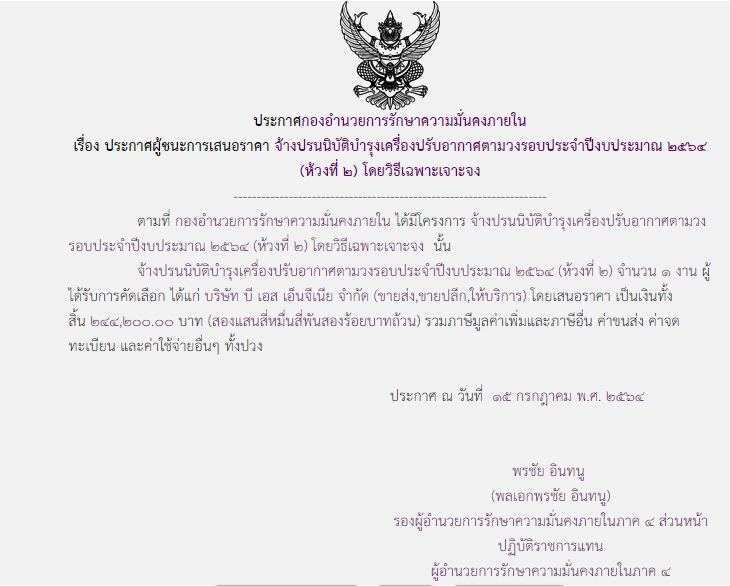 ประกาศผู้ชนะการเสนอราคา จ้างปรนนิบัติบำรุงเครื่องปรับอากาศตามวงรอบประจำปีงบประมาณ ๒๕๖๔ ( ห้วงที่ ๒ ) โดยวิธีเฉพาะเจาะจง ( ๒๔๔,๒๐๐.๐๐ บาท )