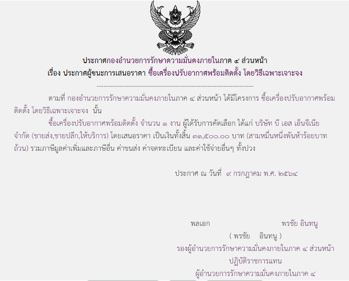ประกาศผู้ชนะการเสนอราคา ซื้อเครื่องปรับอาหาศพร้อมติดตั้ง โดยวิธีเฉพาะเจาะจง ( ๓๑,๕๐๐.๐๐ บาท )