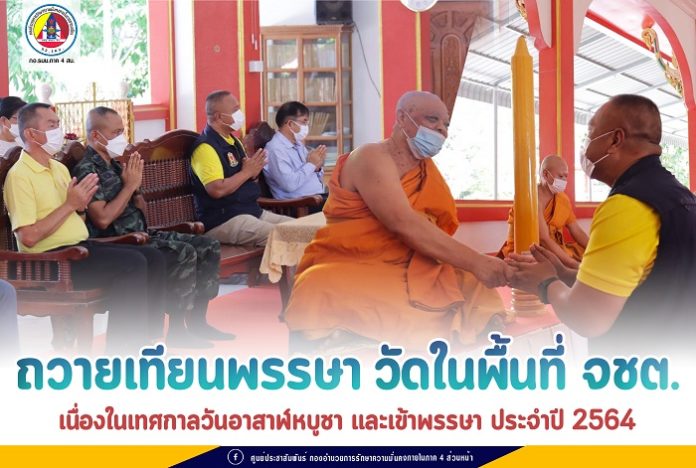 วันนี้ 24 กรกฎาคม 2564 เวลา 11.00 น. พลโทเกรียงไกร ศรีรักษ์ แม่ทัพภาคที่ 4 /ผู้อำนวยการรักษาความมั่นคงภายในภาค 4 ถวายเทียนพรรษา และถวายปัจจัยทำบุญ เนื่องในเทศกาลวันอาสาฬหบูชา และเข้าพรรษา ประจำปี 2564 เพื่อถวายเป็นพุทธบูชา ตลอดจนเพื่อความเป็นสิริมงคลและส่งเสริมทำนุบำรุงพระพุทธศาสนา สืบสานประเพณีวัฒนธรรมอันดีงามให้ดำรงคงอยู่สืบไป ณ วัดเวฬุวัน อำเภอเมือง จังหวัดยะลา, วัดยูปาราม ตำบลยุโป อำเภอเมือง จังหวัดยะลา และวัดสุวรรณากร (วัดบ่อทอง) ตำบลบ่อทอง อำเภอหนองจิก จังหวัดปัตตานี ภายใต้มาตรการเฝ้าระวังและป้องกันโรคติดเชื้อไวรัสโคโรนา 2019 (covid-19) อย่างเคร่งครัด