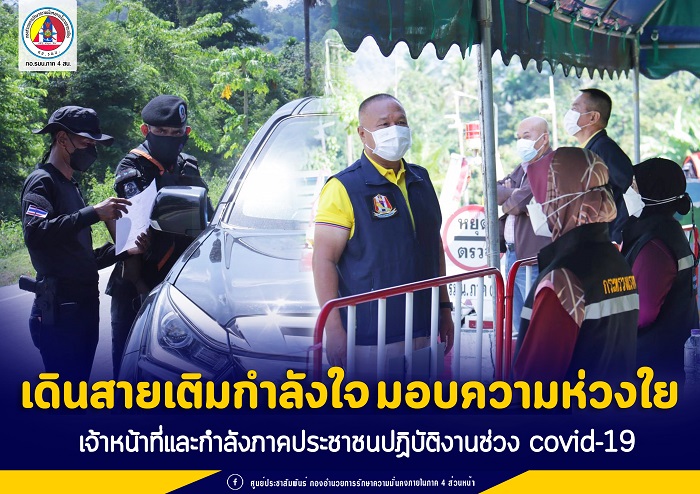 โดย แม่ทัพภาคที่ 4 ได้ตรวจเยี่ยม พบปะพูดคุย สอบถามปัญหาข้อขัดข้องในการปฏิบัติงาน กำชับถึงนโยบายในการทำงาน และการรักษาระดับมาตรการในการป้องกัน และเฝ้าระวังการแพร่ระบาดของเชื้อไวรัส COVID-19 ควบคู่กับการควบคุมพื้นที่ให้เกิดความปลอดภัย ตลอดจนให้กำลังพลมีการประสานการทำงานร่วมกันอย่างเข้มแข็ง เพื่อสร้างความมั่นใจอุ่นใจให้กับพี่น้องประชาชนในพื้นที่ เน้นย้ำถึงการสร้างความเข้าใจให้กับพี่น้องประชาชนในมาตรการการป้องกันการแพร่ระบาดของเชื้อไวรัส COVID-19 ทั้งมาตรการของจังหวัดและกระทรวงสาธารณสุข โดยเฉพาะในพื้นที่ของอำเภอรือเสาะ จังหวัดนราธิวาส ซึ่งมีการประกาศล็อกดาวน์ไปเมื่อวันที่ 20 กรกฎาคมที่ผ่านมา จนถึงวันที่ 25 กรกฎาคม 2564 หรือวันนี้ แต่หากสถานการณ์การแพร่ระบาดของเชื้อไวรัส COVID-19 ยังไม่ดีขึ้น อาจมีการขยายวันล็อกดาวน์เพิ่มขึ้นไปอีก ขอให้เจ้าหน้าที่ทุกฝ่ายที่เกี่ยวข้องเร่งทำความเข้าใจถึงการป้องกันการแพร่ระบาดของเชื้อไวรัส COVID-19 เพื่อให้พี่น้องประชาชนให้ความร่วมมือทำให้สถานการณ์ คลี่คลายได้โดยเร็วๆ ทั้งนี้แม่ทัพภาคที่ 4 ได้กล่าวขอบคุณกำลังพล และเจ้าหน้าที่ที่เกี่ยวข้องประจำด่านตรวจคัดกรองทุกนายถึงความเสียสละ และอดทน ในการปฏิบัติงานอย่างเต็มกำลังความสามารถ สถานการณ์การแพร่ระบาดของเชื้อไวรัส COVID-19 ในพื้นที่ยังคงน่าเป็นห่วง การให้กำลังใจซึ่งกันและกันถือเป็นสิ่งที่สำคัญมาก ขอให้กำลังพลและเจ้าหน้าที่ทุกคนได้รักษาสุขภาพร่างกาย และจิตใจให้แข็งแรง เป็นตัวอย่างที่ดีให้กับพี่น้องประชาชนในการปฏิบัติงานภายใต้มาตรการป้องกัน เชื้อไวรัส COVID-19 ก่อนมอบอุปกรณ์ในการป้องกันตนเองจากเชื้อไวรัส COVID-19 ให้กับกำลังพล และเจ้าหน้าที่ไว้ใช้ในการปฏิบัติงาน เพื่อให้เกิดความปลอดภัยอย่างสูงสุด
