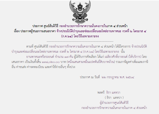 จัดซื้อ จัดจ้างประกาศผู้ชนะการเสนอราคา ประกาศผู้ชนะการเสนอราคา จ้างปรนนิบัติบำรุงและซ่อมเปลี่ยนอะไหล่ยานพาหนะ งวดที่ ๒ ไตรมาส ๔ ( ก.ค.๖๔) โดยวิธีเฉพาะเจาะจง ( ๑๓๘,๐๒๐.๐๐ บาท ) July 25, 2021 557 Share Facebook Twitter Google+ Telegram LINE ศูนย์สันติวิธี กอ.รมน.ภาค ๔ สน.