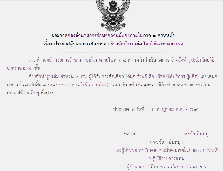 จัดซื้อ จัดจ้างประกาศผู้ชนะการเสนอราคา ประกาศผู้ชนะการเสนอราคา จ้างจัดทำรูปเล่ม โดยวิธีเฉพาะเจาะจง ( ๙,๐๐๐.๐๐ บาท ) July 25, 2021 557 Share Facebook Twitter Google+ Telegram LINE กอ.รมน.ภาค ๔ สน.