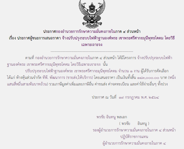 ประกาศผู้ชนะการเสนอราคา จ้างปรับปรุงระบบไฟฟ้าฐานองค์พระ เขาพระศรีศากยมุนีพุทธโคดม โดยวิธีเฉพาะเจาะจง ( ๑๔๓,๐๐๐.๐๐ บาท )
